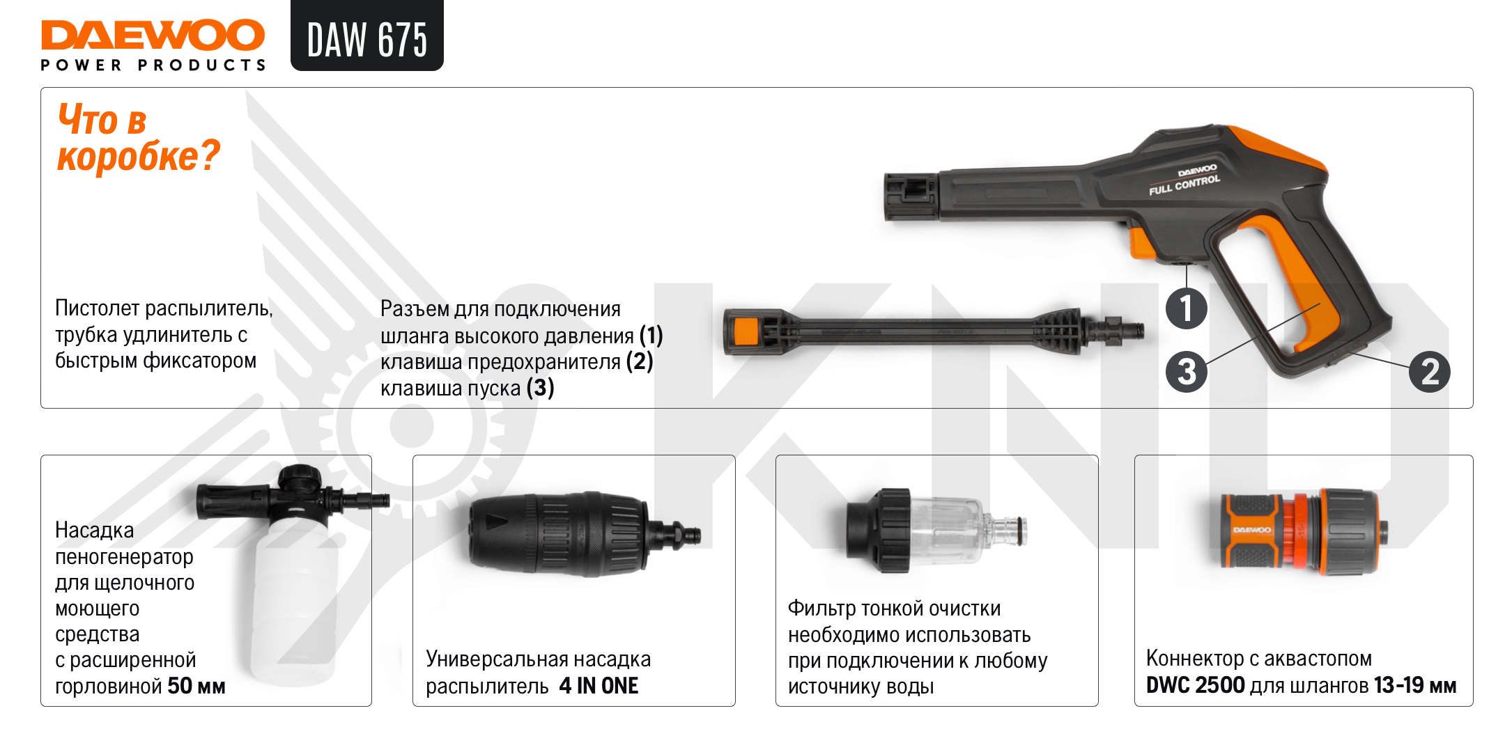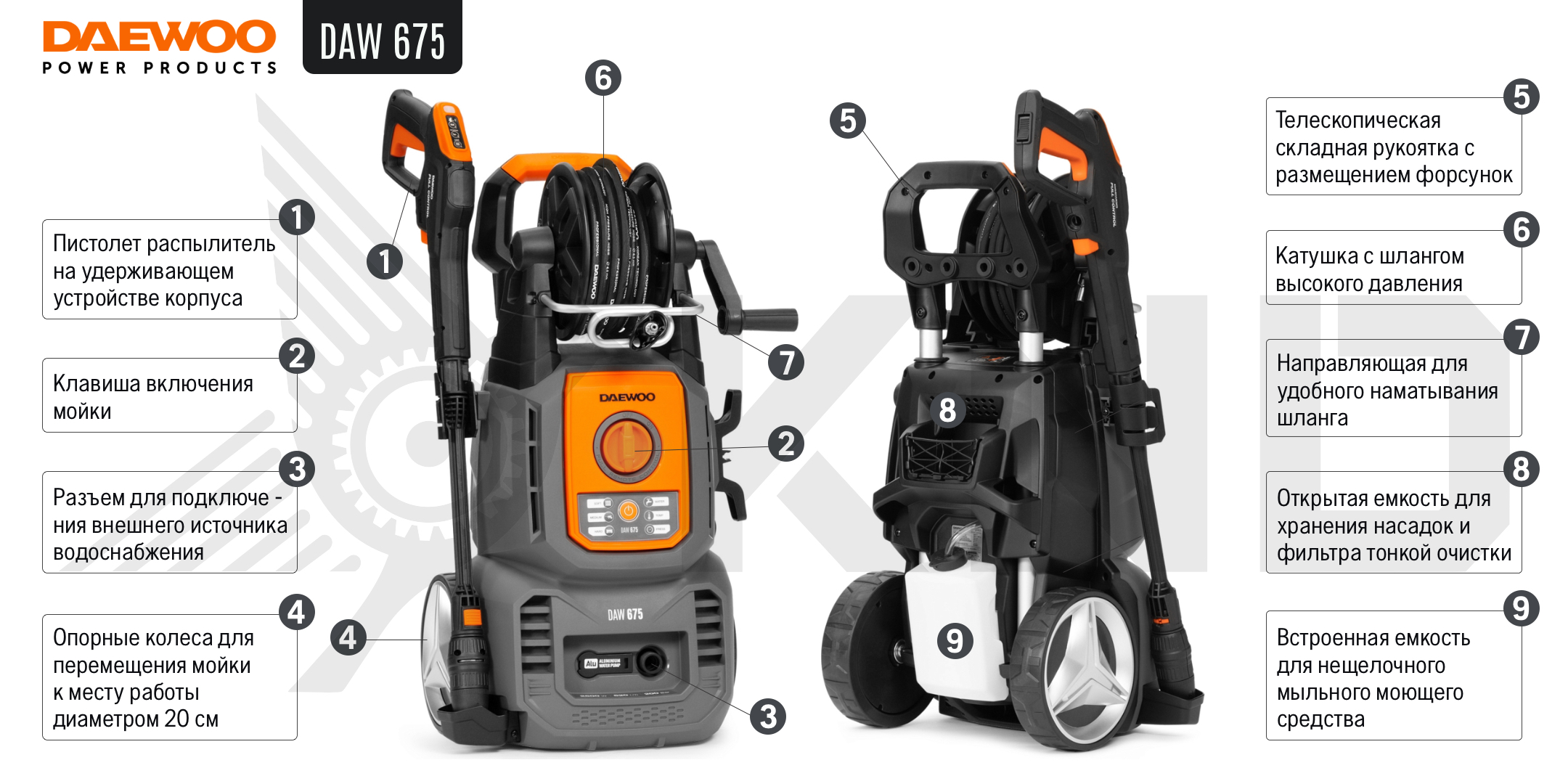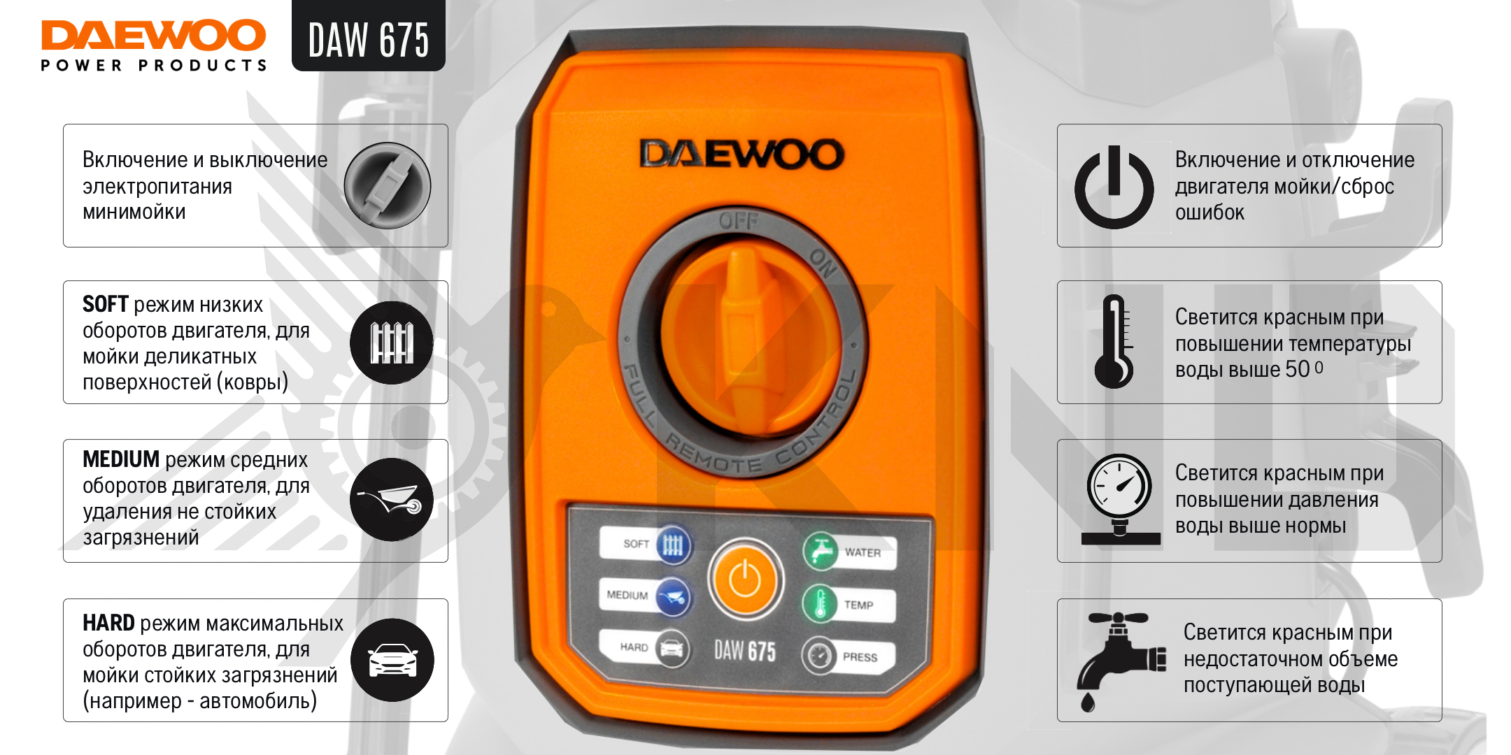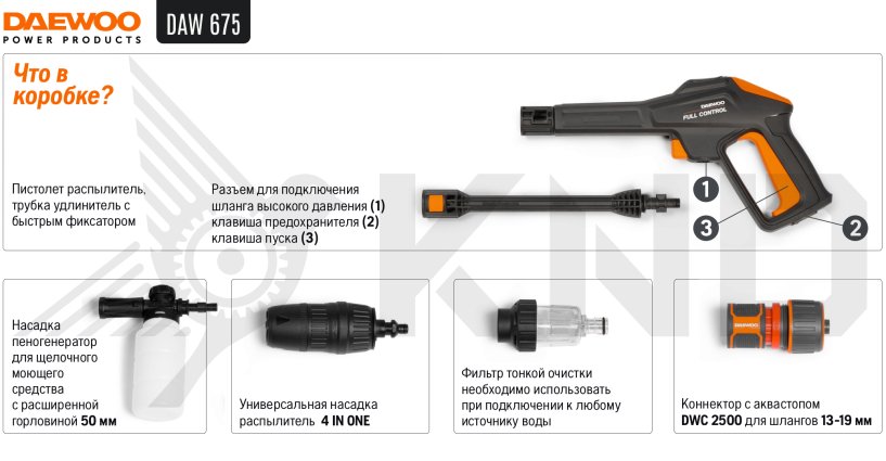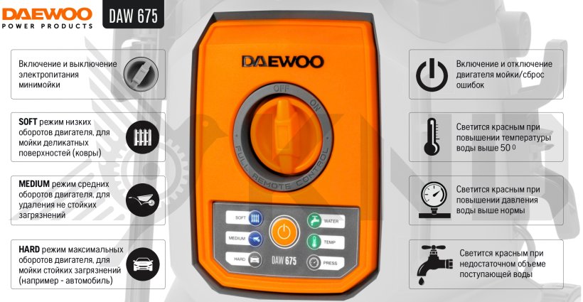 Только у нас мойка высокого давления DAEWOO DAW 675 по самой доступной цене! На все товары распространяется гарантия от производителя. Оперативная доставка в Казани. Оформите заказ сейчас и специалисты интернет-магазина свяжутся с Вами в течение нескольких минут.Документация